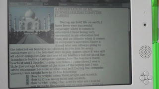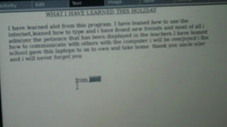 Our classes run from 9 to 11 and we have accomplished several learning projects designed to emphasize the basics and to challenge the creativity of the students while they are also introduced to new programs and the many capabilities of the XO. Over the past few weeks the students in the older class have created superheroes and drawn them in paint, imported their pictures into write and written a back story to their heroes lives. They then went on Wikipedia and copied selections from different scientific articles relating to their heroes superpowers and pasted these under a separate section of their profiles. They have also made numbered lists of things describing themselves and then had the lists taken and mixed up so that they had to play a game to find out who each list described. They have taken notes in Write using bulleted lists on Mesh Networking and used chat to talk to each other. They have explored Memorize and made their own Memorize games matching phrases in their local Pidgin dialect to phrases in standard English, which they then swapped and played each others games. Most recently we talked about story writing, about setting, plot, conclusion and characters, after which I gave them a list of different animals and a list of themes from which they picked to write their own fairy tales. On Monday they will be making scenes from their stories, which they illustrated with photos and painted pictures today, come to like in Scratch, as the list I provided was made up only of animals that are options as Sprites. Also starting on Monday they will have the opportunity to sign-out their personal laptop at the end of the day and take it home with them, something we have been planning so as to happen in the most efficient and organized manner so that the students can share their work with their families and explore at home, while still guaranteeing that we are able to use the laptops in the other innovative capacities we are exploring.