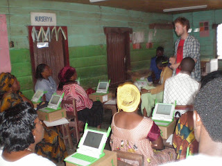 It was teacher training on Tuesday and we didn't get started as far from on time as one might expect (i mean, TIA...) just as we did expect though, it was raining heavily, but to be honest I think it gave the small dirty classroom that served as the Jamadianle school's main hall before they moved to the knew and bigger location some miles away some atmosphere and made all of us who were working inside feel a little closer. At least that's the way I try to look at the rain situation, for looking at it any other way would perhaps be rather dire as it is raining almost every day now. But on to the actual training :) we had about 15 teachers show up, including the Head Teacher of the primary school, and the Head Teacher of the nursery. Most of the teachers were well dressed in traditional looking attire and appeared to be in their thirties, quite a contrast with many of the Rwandan teachers who were quite a bit younger. We started out the training by mainly focusing on the fundamentals of the XO, how to open and close programs, how to turn on and shut down the computer, how to navigate the different views etc. We then went through a short sample lesson involving Record and Write, where they took a picture of themselves and copy and pasted it into write so they could label it. We also showed them several more of the XO's features including how to make a spreadsheet in Write, something that was very practical for their own use in the classroom and with which the head nursery instructor immediately began to compile a table of her students and their contact info with. 2 hours into the training and we decided to wrap it up, feeling like any more would be too much to introduce all at once and besides we were getting pretty hungry for lunch. Many of the teacher seemed very pleased and several approached me with questions about using the computers in their classrooms and were also eager to further explore the laptops at the next training, which we will be having weekly for the duration of the program. All in all this training went perhaps better than I had expected and I think the teachers may really be as open to them, given real evidence and a thorough understanding of their potential, as the Mr. Orock, the director of the UAC, has said on many occasion, though at one point one teacher did ask to speak privately with us at some point and I can only postulate that there may be skeptics among them who we would do well to sit down with and discuss rather than just read the feel of the room. All that remains to be done now is the grand launching ceremony on Monday, after which we will have another, more in depth training on Tuesday, in preparation for the start of classes and the Summer Holiday Caravan come this Wednesday. I can hardly wait!