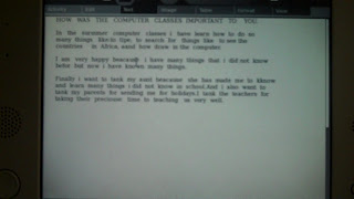 When we arrived at the compound the kids were as usual milling around in chaos, but there was an extra element of activity, which we were to soon find out was the presence of some 100 candidates who were applying for teaching positions in the Jamadianle School. Evidently the 100 percent success rate on their final exams made the school a popular choice and there were many applicants for a fairly limited number of positions, not a bad situation to be in. It was somewhat awkward when I went to ask the Head Nursery teacher Madam Ada if t wouldn't be too disturbing to throw down a massive Harambee circle in the middle of all this, at which point she took me around to each of the rooms where the hopeful teachers to be were waiting for their interviews and made those stand up who professed to be "computer literate". The number proved awkwardly small and more awkward still was their obvious struggle between an honest assessment of their abilities and their desire to be considered for the job. After which Madam Ada assured me that they would only be hiring new teachers who had skills in ITC so as to adequately support the new OLPC aspect of their classes, progress, i guess. We did manage to secure permission to Harambee and after a rousing (and somewhat sweaty) run through of our favorite cheers and chants we all packed into the main hall for our final class. In this class the students were asked to make a presentation about what they had learned over the summer, and in this they could use any combination of their favorite programs to make it as multimedia and informative as possible. Many of the students stuck with the professional format of writing up a numbered list of their achievements and these I read to much excitement as they very succinctly included most of the goals we had set out to accomplish at the start of our program. Other students used Scratch presentations or Record to make full motion presentations demonstrating the many things they had learned and each of these deserved to be recorded and saved as they really made it clear how far these students had come over the course of the summer. After taking in all these projects it was time to take up the XOs and say goodbye, and as hard as this was we did it knowing the XOs would go on to benefit more children during the school year and that those who had been through our program had enjoyed a really wonderful experience. Besides which several of them had created email accounts and would be keeping in touch with their teachers form America.